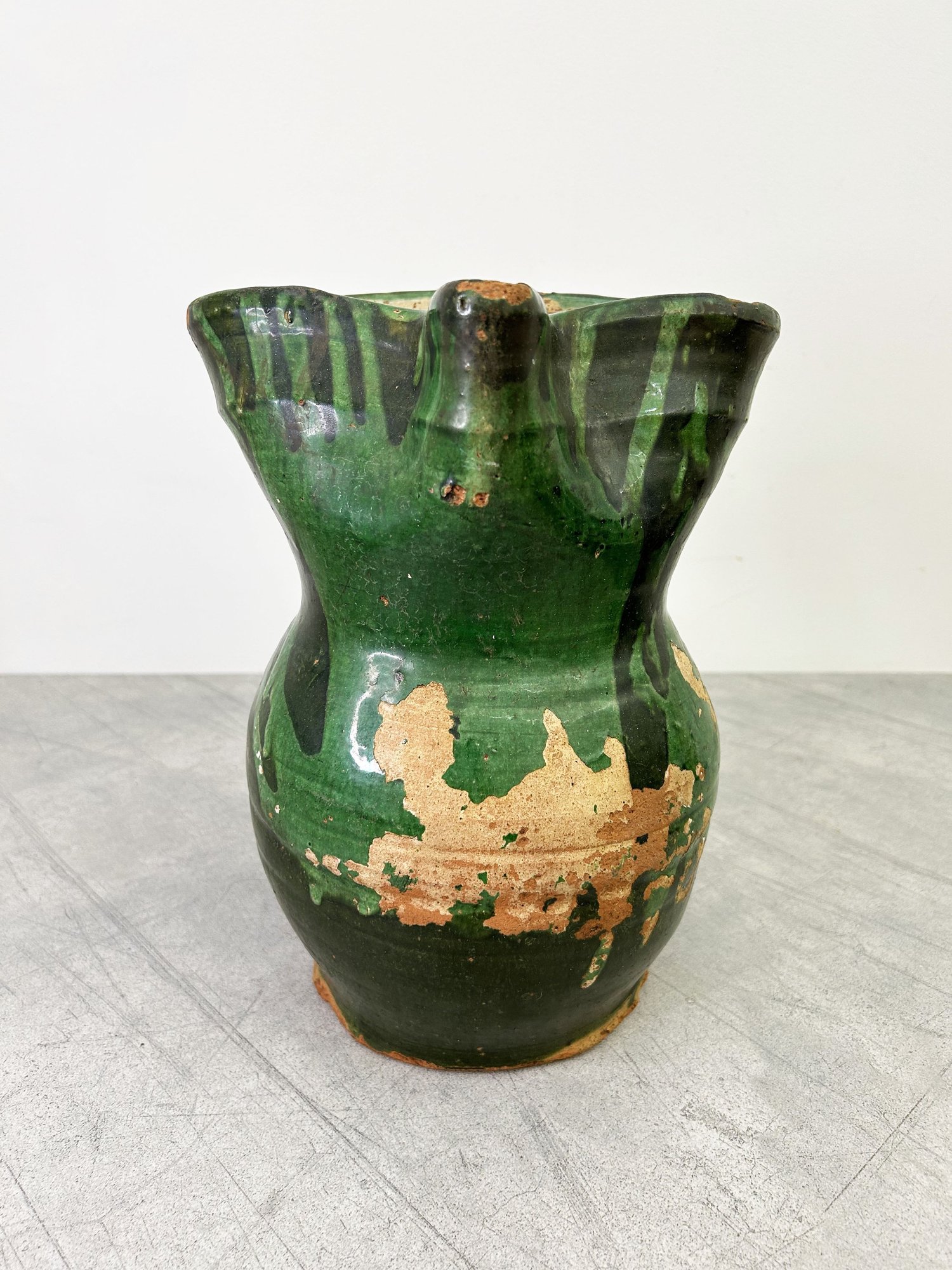 An antique jug in a unique glaze with wonderfully exaggerated proportions. Wine and water jugs from Puglia usually have the most extensive decorations and this one is no exception. The extraordinary surface that has eroded with age to obtain that magic patina that only occurs with use over time. The unique, well-loved patina reveals the terracotta underneath, made all the more charming through its erosion and evolution from years of use, serving a family at meal times. The jug features a sculptural form with a beautifully pinched spot that fans out over its rotund body. This rare piece has a scale that is impressive, along with the spirited pattern that echoes nature in its varying shades of verdant green. The hand thrown vessel with its distinctive pattern and elegant form would be ideal as a vase for fresh flowers or as a decorative display piece.